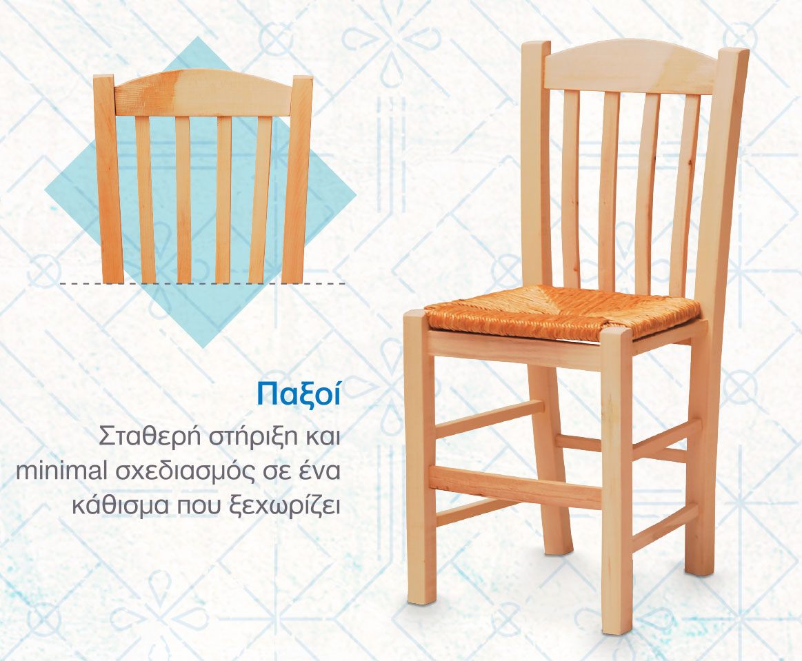 Με τεχνογνωσία, εξειδίκευση, καταρτισμένο προσωπικό, εξοπλισμό και εμπειρία, από το 1963 κατασκευάζουμε παραδοσιακές ξύλινες καρέκλες!